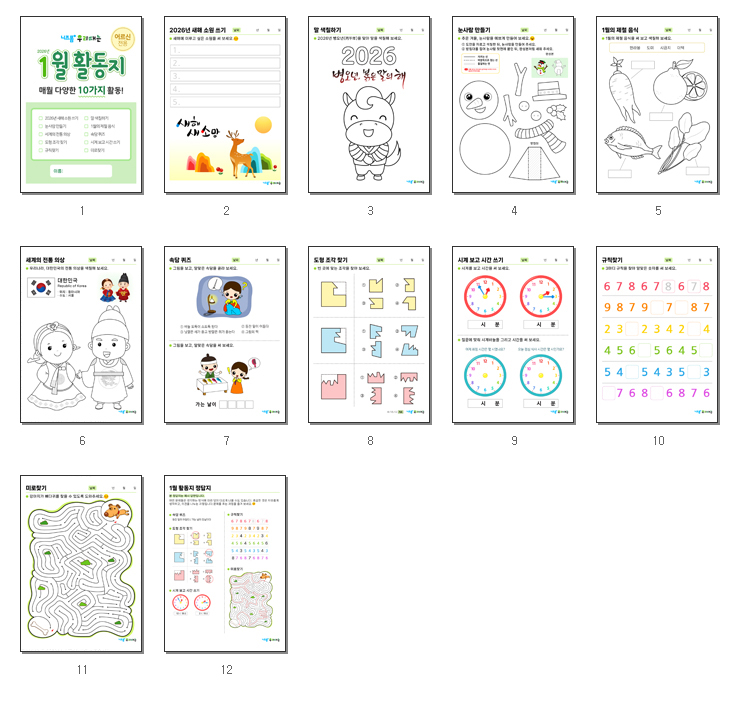 월 활동지는 해당 월의 특화된 주제(계절, 절기, 기념일 등)로 색칠하기, 만들기, 글쓰기, 두뇌 퀴즈, 제철 음식 알기 등 다양한 10개의 활동으로 구성되어 어르신들의 흥미를 높이고, 인지 능력 향상에 도움을 줄 수 있는 콘텐츠입니다.