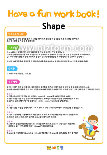 본 콘텐츠는 니즈폼(www.nizform.com)을 통해 서비스되는 영어창의놀이_모양놀이(학습방법)(으)로서, 프린트하여 사용하시면 됩니다.