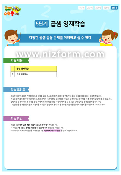 본 콘텐츠는 니즈폼(www.nizform.com)을 통해 서비스되는 곱셈5단계(으)로서, 프린트하여 사용하시면 됩니다.